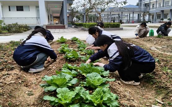 Ảnh 2. Học sinh trường PT DTNT tỉnh Cao Bằng chăm sóc vườn rau sau giờ học