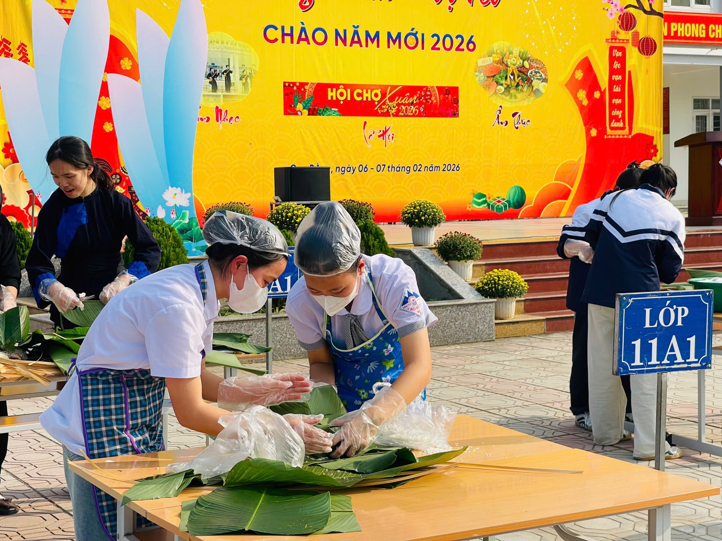 Buổi sáng 07/02/2026, các lớp tiếp tục hoạt động thi nấu 03 món ăn truyền thống mang hương vị Tết Việt. Từ những nguyên liệu quen thuộc, học sinh đã thổi hồn dân tộc vào từng món ăn, vừa giữ được bản sắc, vừa thể hiện sự sáng tạo qua phần chế biến cũng như trưng bày các món ăn. Sau phần thi học sinh các lớp đã rất phấn khởi khi được trao giải cho phần thi của lớp mình: Giải Nhất: 12A3, Giải Nhì: 12A4, 11A2, Giải Ba: 12A5, 11A3, 10A5, Khuyến khích: 12A1,2; 11A1,4,5; 10A1,2,3,4. Đặc biệt có 02 lớp được trao giải chuyên đề trong phần thi này: Giải thuyết trình hay nhất: 10A5, Giải trưng bày nghệ thuật nhất: 12A5.