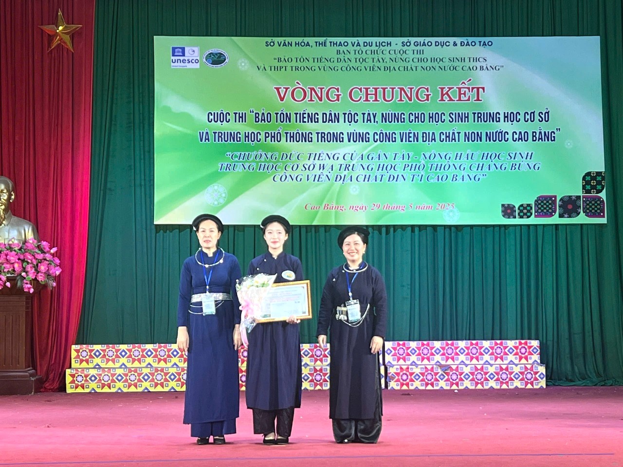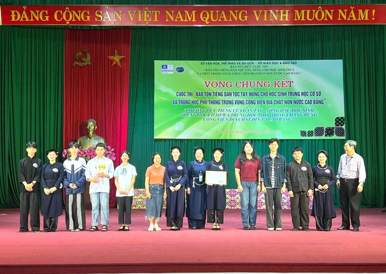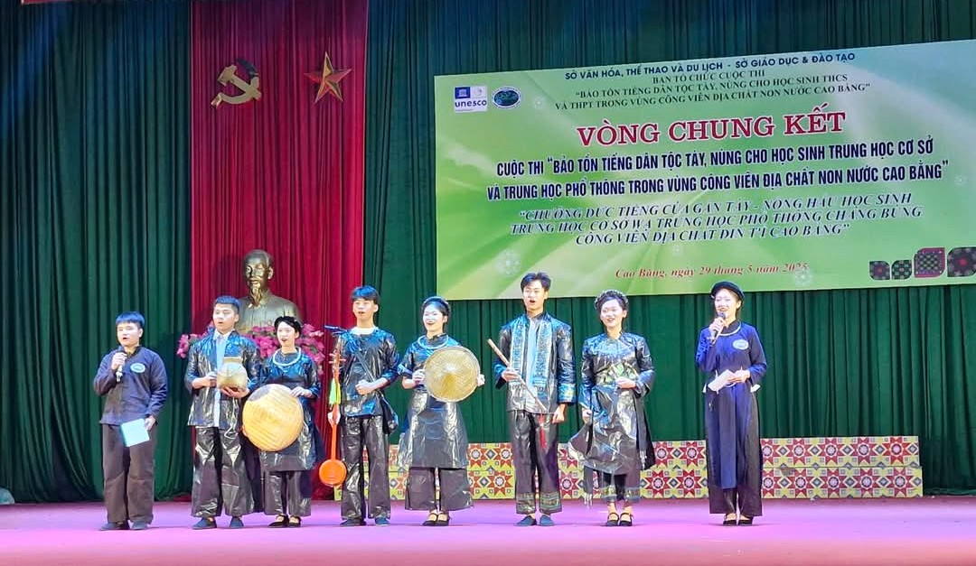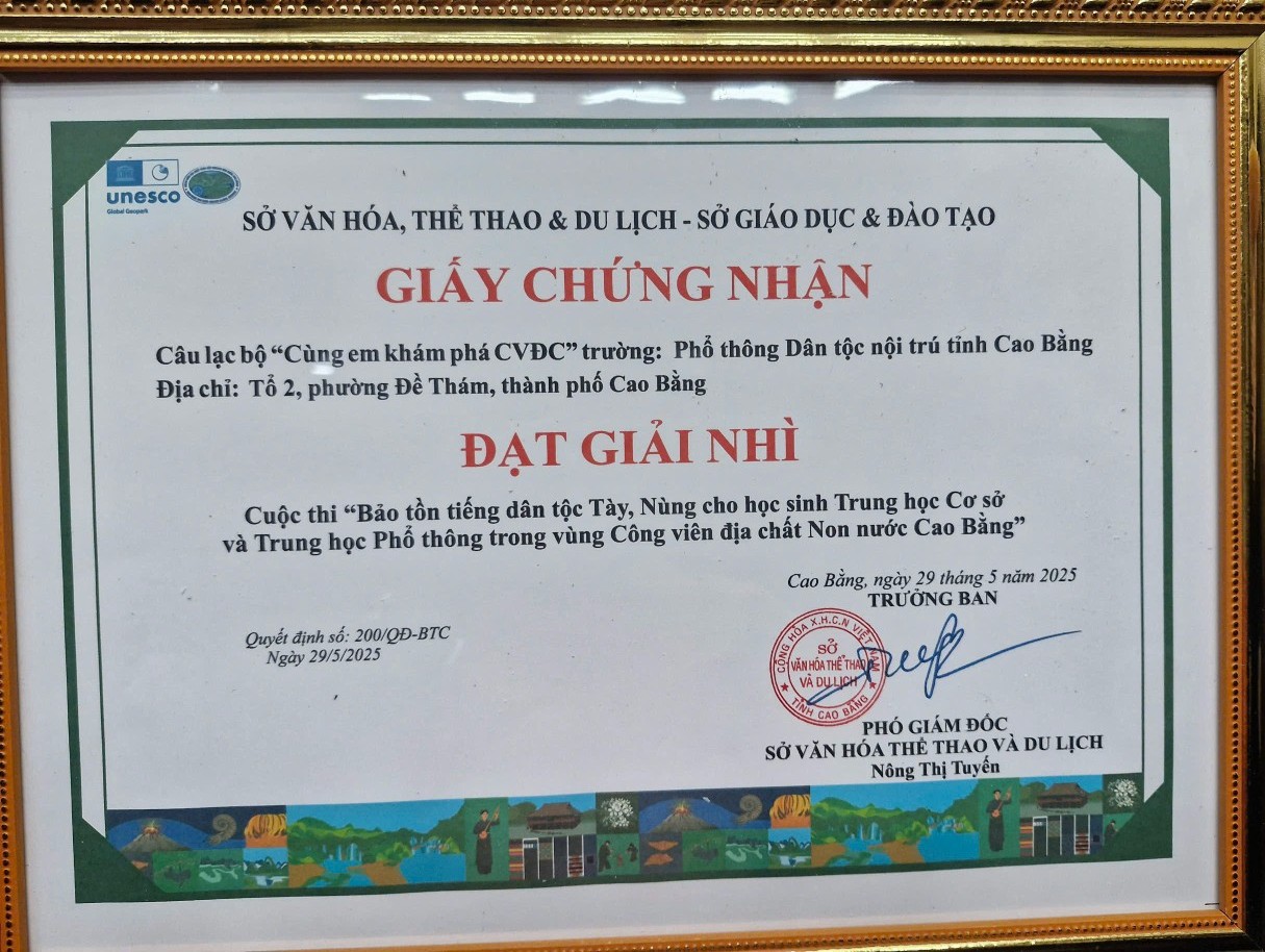 Chiều ngày 29/5/2025, Câu lạc bộ “Cùng em khám phá Công viên địa chất” của Trường Phổ thông Dân tộc Nội trú tỉnh Cao Bằng đã tham dự vòng chung kết cuộc thi “Bảo tồn tiếng dân tộc Tày, Nùng cho học sinh trung học cơ sở và trung học phổ thông trong vùng Công viên địa chất Non nước Cao Bằng”.